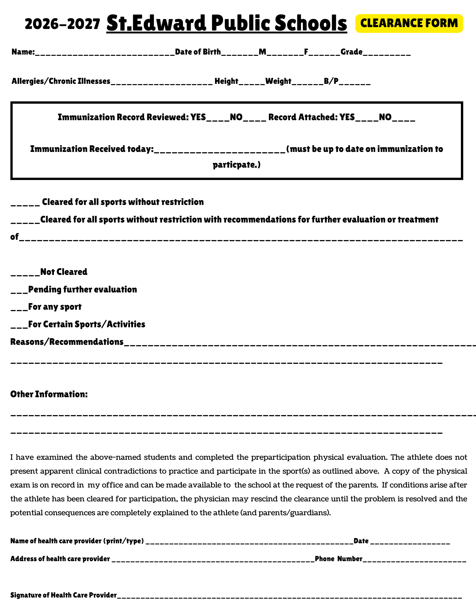 SEHS CLEARANCE FORM 26/27